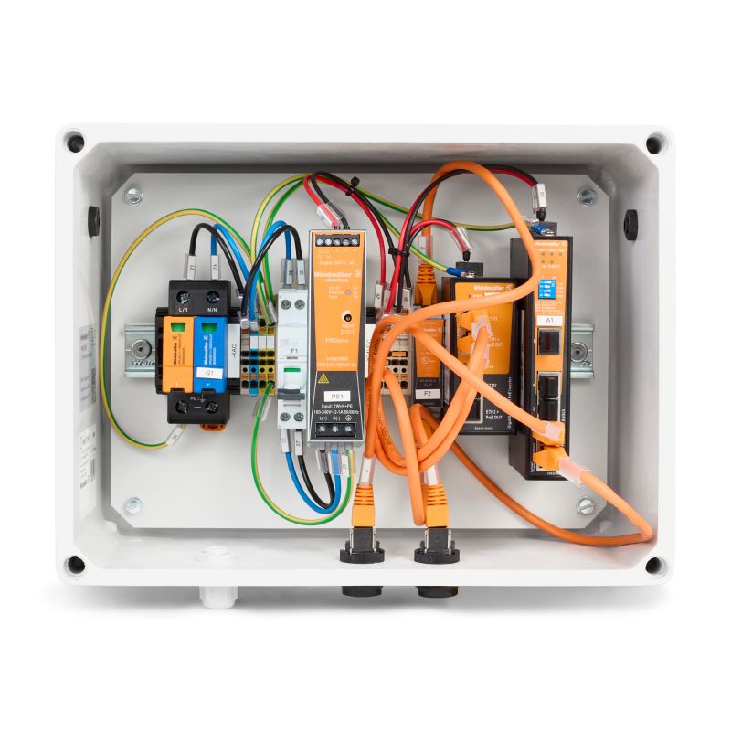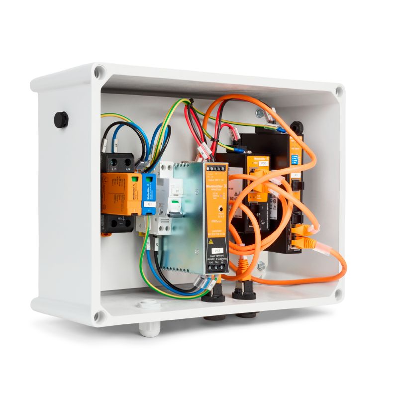 Photovoltaics, Assembled enclosure, Communication module, 230 V AC, Surge protection I, Battery powered, Current monitoring, Monitoring components, Limit value monitoring, Communication Box, RJ45, PoE