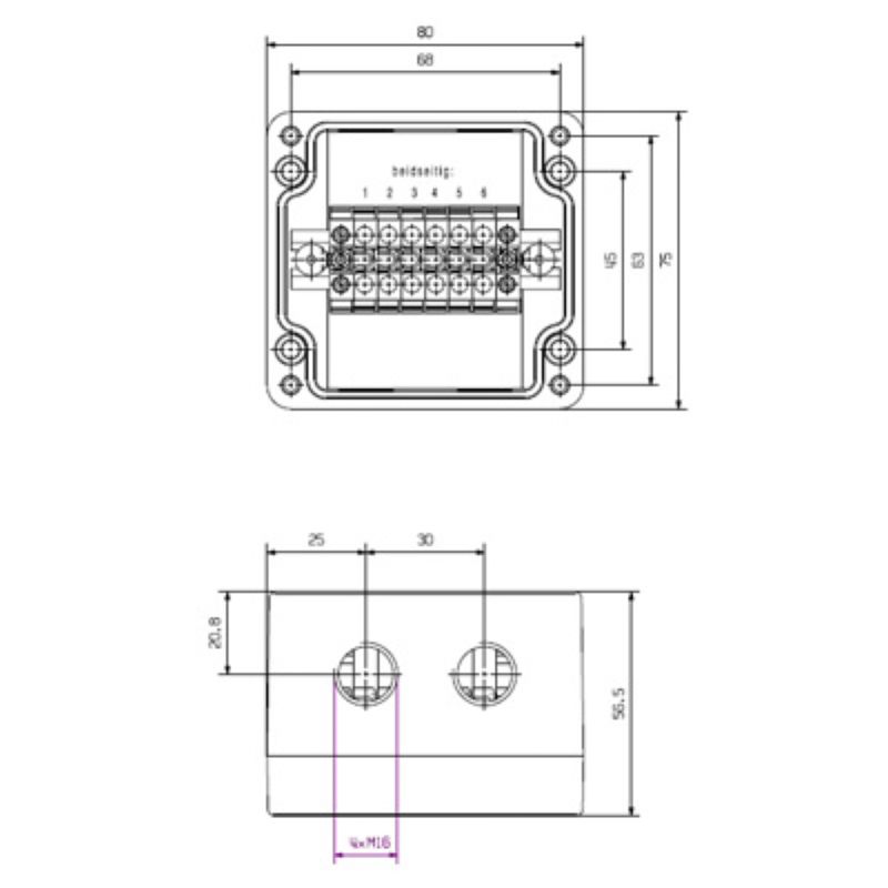 Terminal Box, ATEX ll 2GD T85°C Ex e ll T6, KLIPPON POK 080806 EX, KL SET 6A4 SDrill holes side A: 2 x M16x1.5, Drill holes side B: 2 x M16x1.5